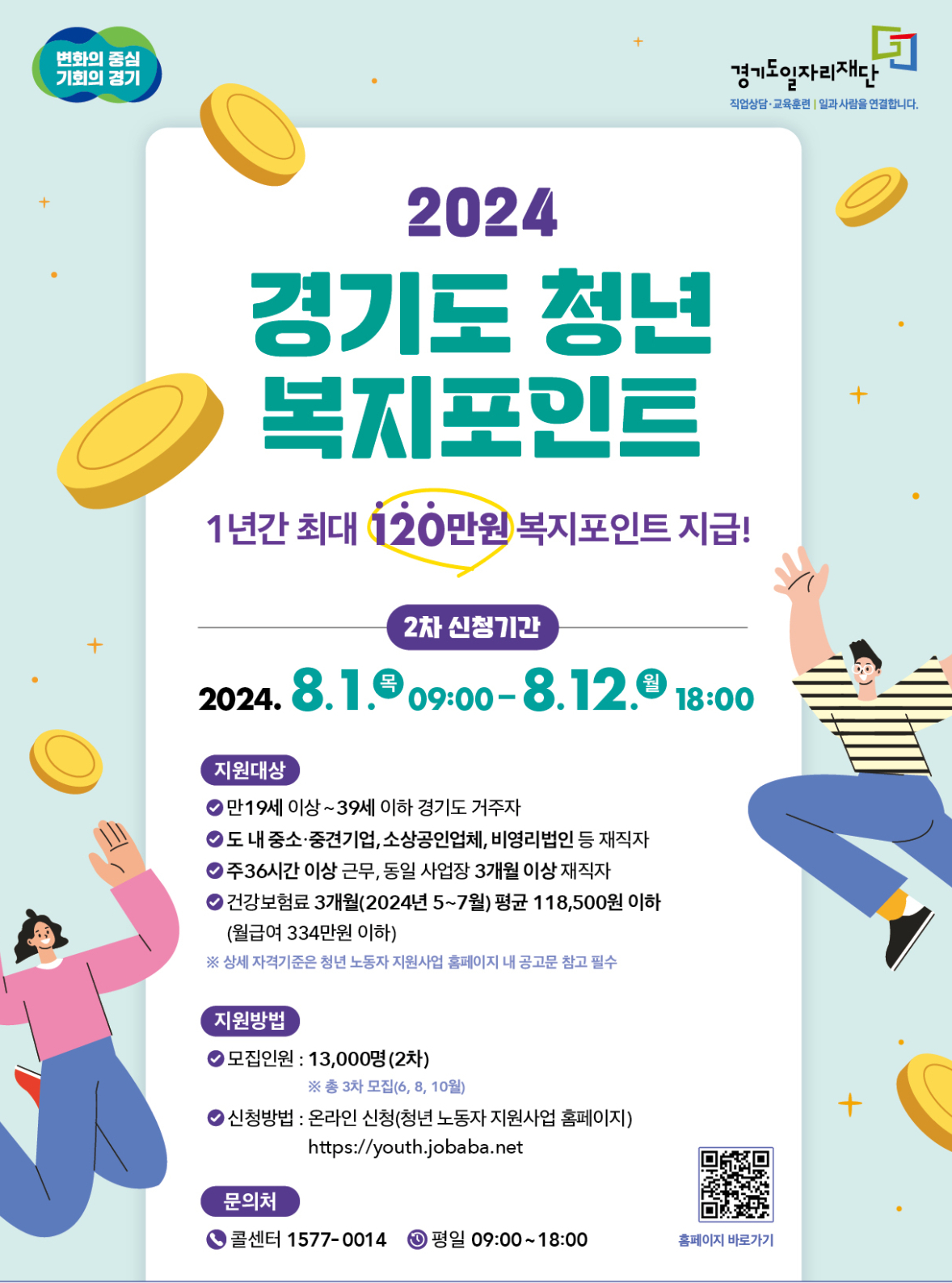 [모집 공고] 2024년 경기도 청년 복지포인트 2차 모집 공고 (8.1.~ 8.12.18시) 등록일 :2024-07-26 1. 신청기간 : 2024. 8. 1.(목) 09:00 ~ 8. 12.(월) 18:00 2. 모집인원 : 13,000명 (2차) 3. 신청방법 : 청년 노동자 지원