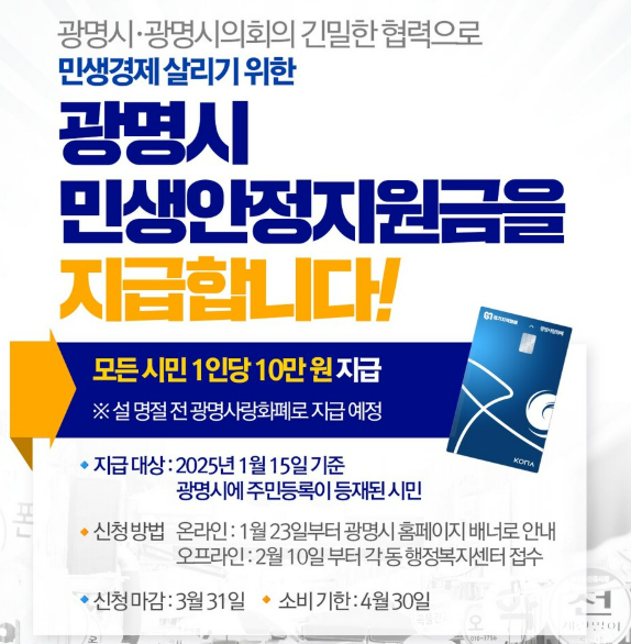 2025년 새해를 맞아 광명시에서 민생회복 지원금 10만원을 모든 시민에게 지급합니다. 이번 지원금은 지역 화폐인 광명사랑화폐로 지급되어 지역 경제 활성화에 기여할 것으로 기대됩니다. 지금부터 광명시 민생회복 지원금의 신청방법, 신청대상, 혜택 등에 대해 자세히 알려드리겠습니다.