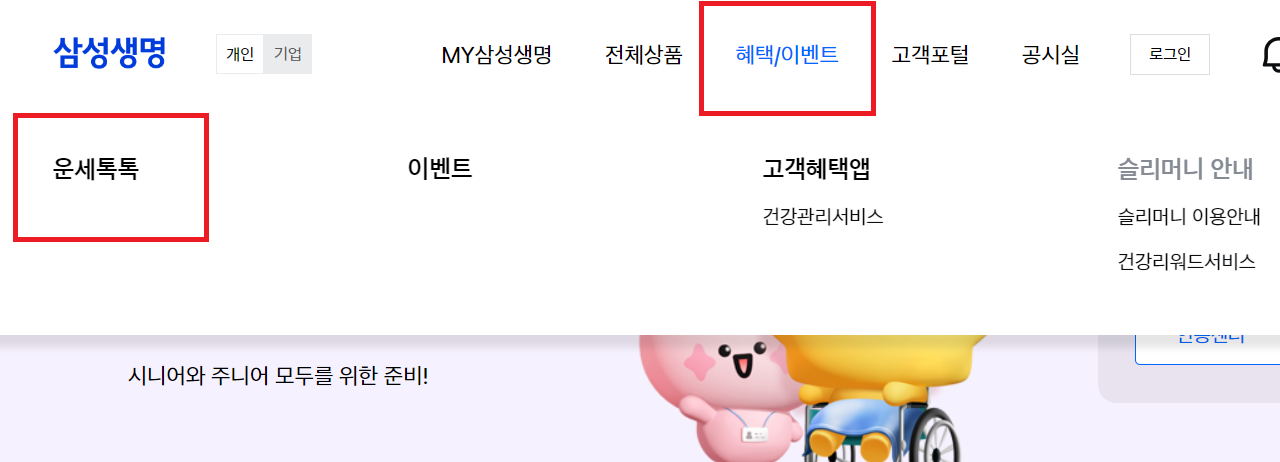 1. 삼성생명 웹사이트에 들어가서 혜택/이벤트탭에 운세톡톡을 클릭합니다.