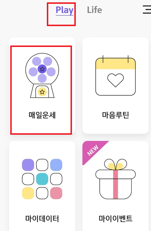 로그인 후 앱의 하단 메뉴나 메인 화면에서 ply 항목을 찾습니다. 여기서 ‘운세’ 카테고리를 클릭하면 다양한 운세 메뉴가 나타납니다.