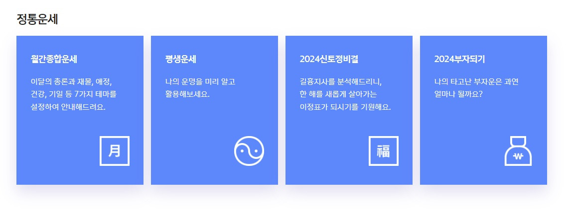 ✅제공 정보: 연간운세, 월별운세, 재물운, 애정운, 건강운 등 다양한 운세를 확인할 수 있습니다.