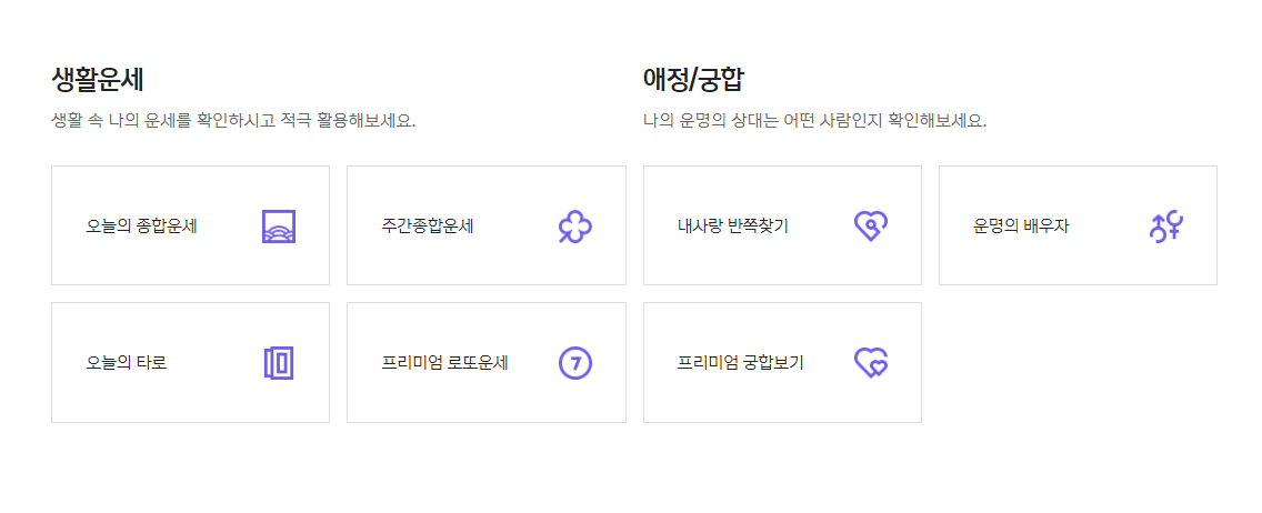 운세 메뉴에 들어가면 여러 가지 운세 서비스 중에서 토정비결과 전통사주를 선택할 수 있습니다. 원하는 운세 종류를 클릭하세요.
