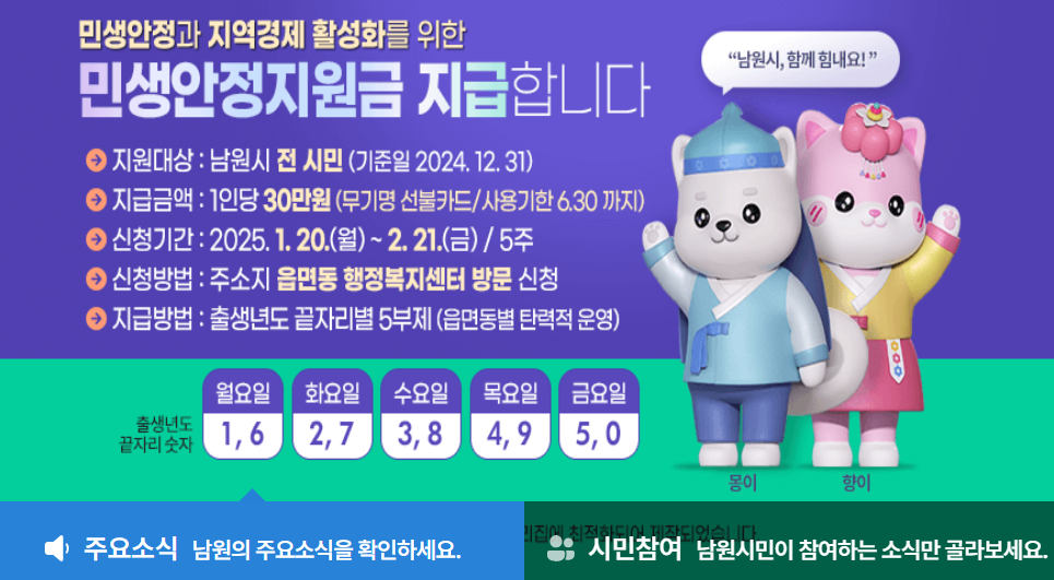 남원시에서 지급하는 이번 지원금이 여러분의 가계와 지역경제에 따뜻한 희망을 더해주길 응원합니다.