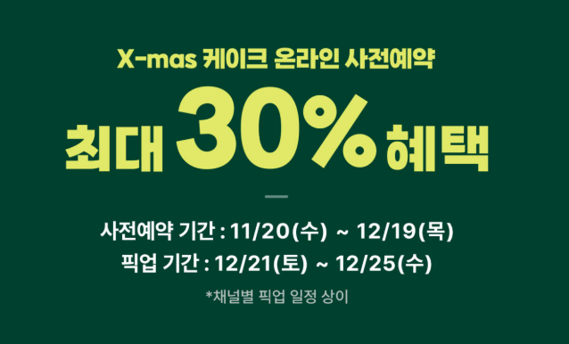 뚜레쥬르 케이크 사전예약은 12월 18일까지이며, 픽업기간은 12.20~12.25일까지이고 최대 20% 할인 받으실 수 있으니 아래의 글을 참고하세요.