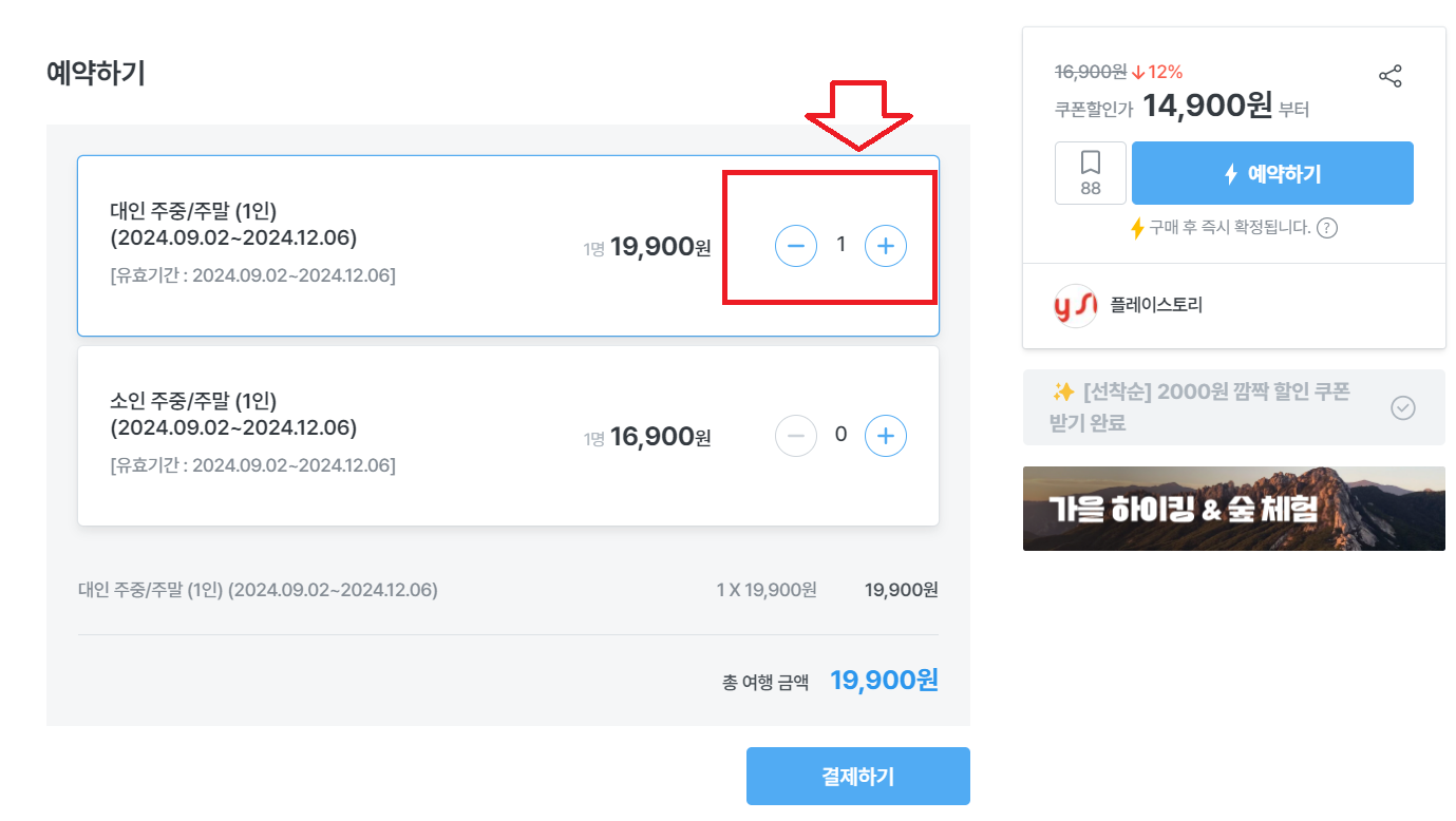 ③ 인원수를 맞게 클릭하시고 예약하기 버튼을 눌러주세요.