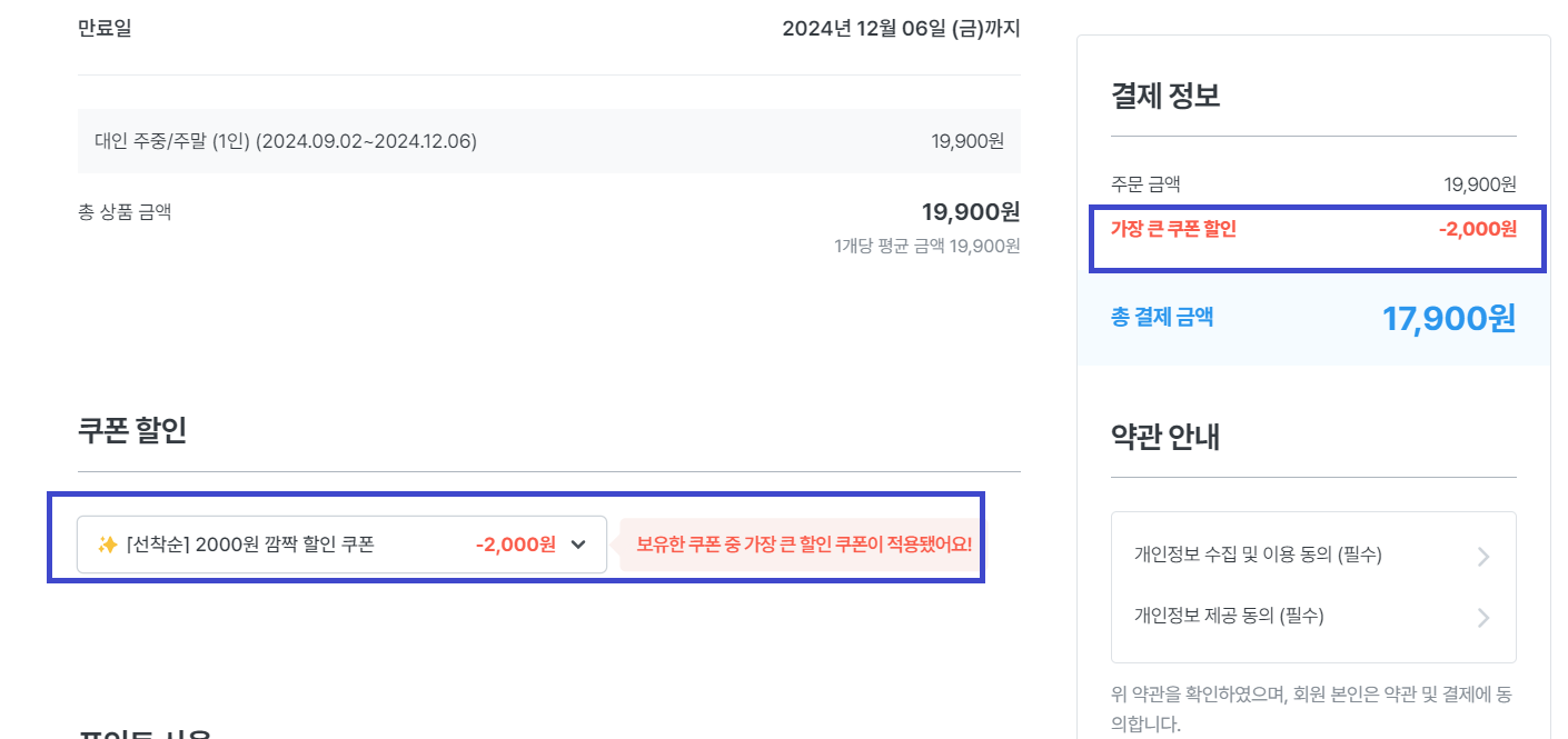 ④ 결제하기를 누르시면 할인쿠폰이 바로 적용됩니다.