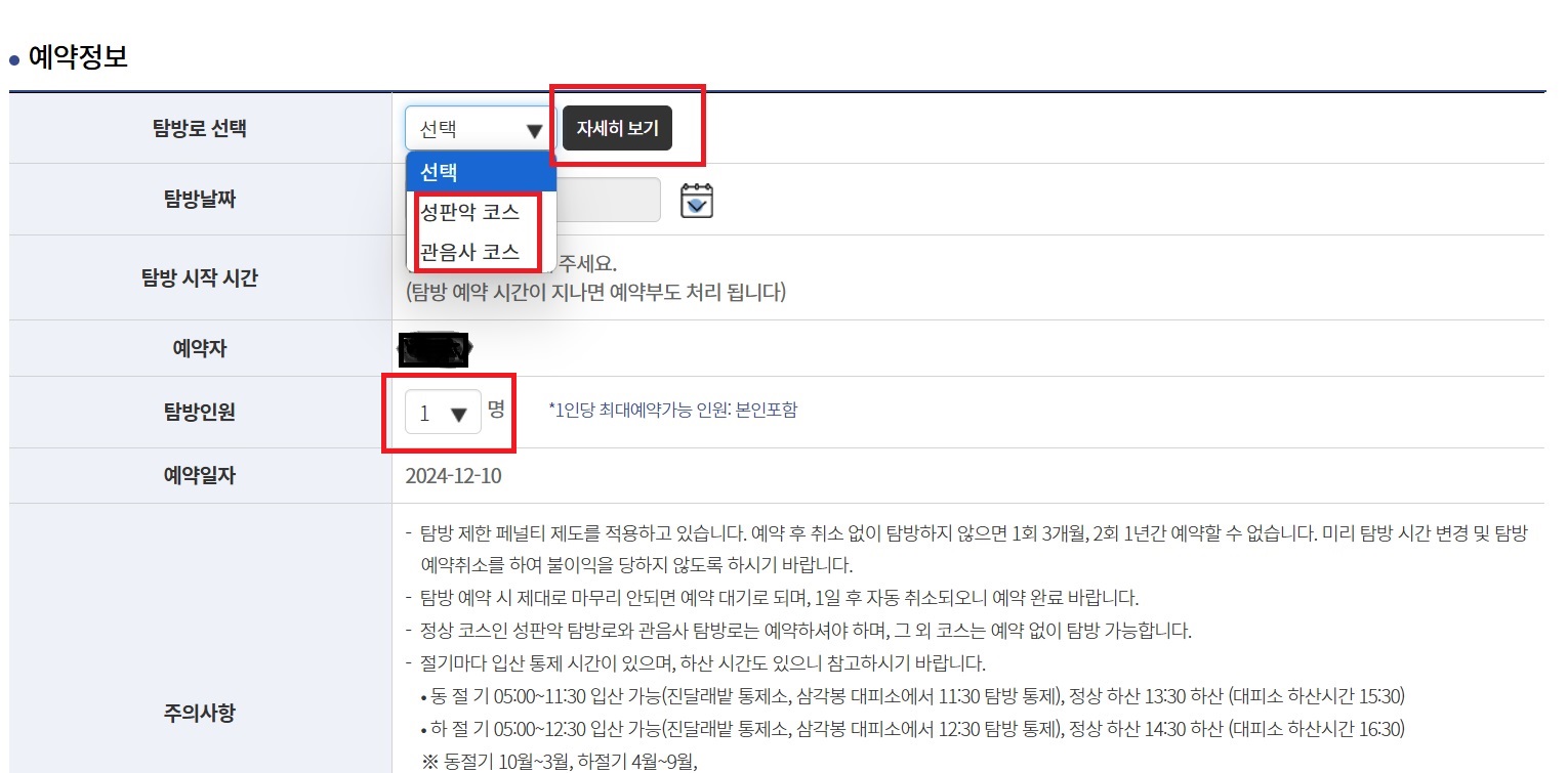 탐방 인원을 입력합니다. 인원은 한정되어 있으므로, 예약 시 주의가 필요합니다.