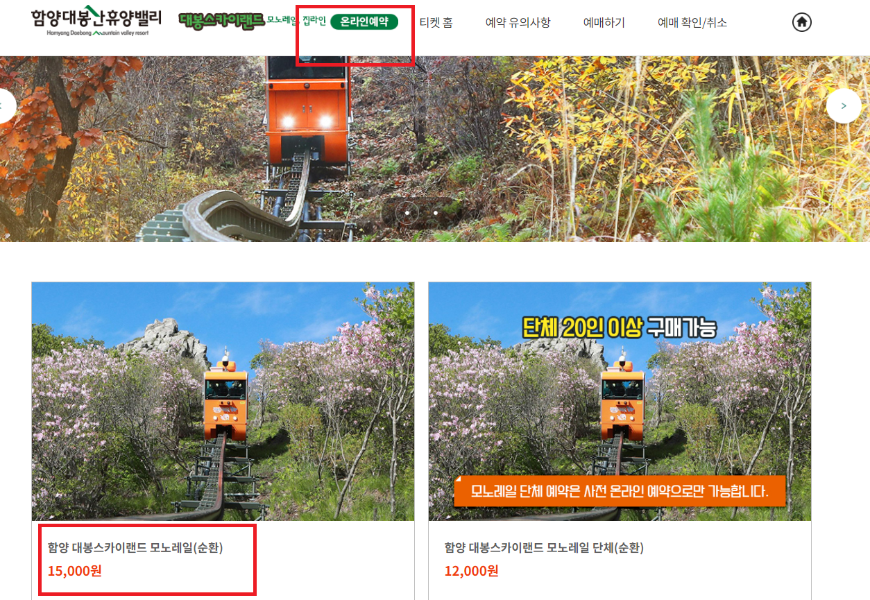 모노레일 티켓 예매는 함양대봉산휴양밸리 공식 웹사이트를 통해 가능합니다.