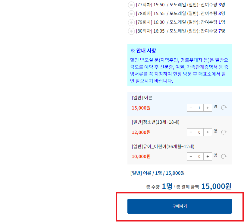 모노레일의 온라인 예매는 매달 15일 오전 10시에 시작됩니다. 이때 다음 달의 모노레일 티켓이 오픈됩니다.