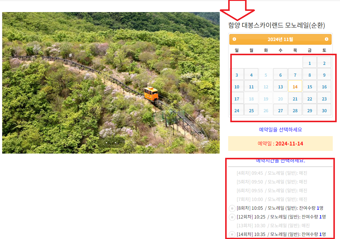 로그인 후, 모노레일 예약 섹션으로 이동하여 원하는 날짜와 시간대를 선택합니다.