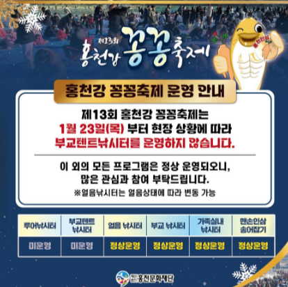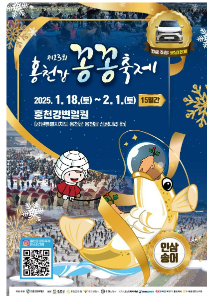 홍천강 꽁꽁 축제는 매년 1월 강원도 홍천에서 열리며, 남녀노소 누구나 즐길 수 있는 겨울 낚시의 매력을 제공합니다. 축제의 주요 프로그램으로는 얼음낚시, 맨손송어 잡기, 가족실내낚시터 등이 있습니다.
