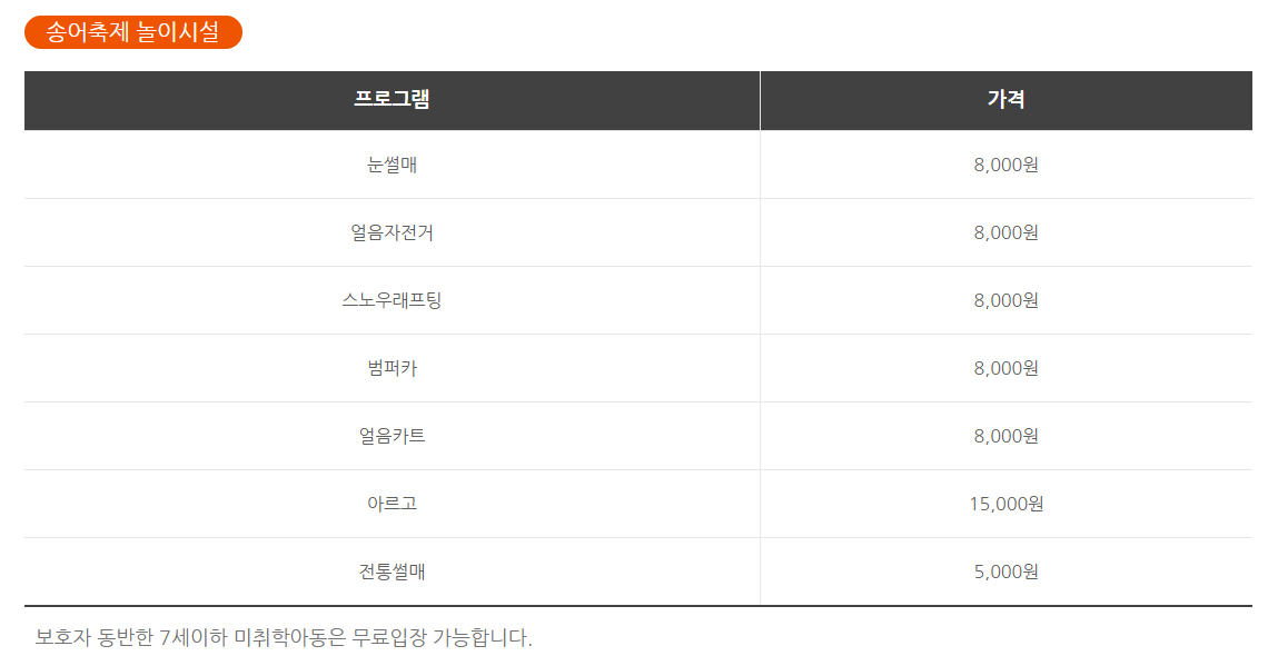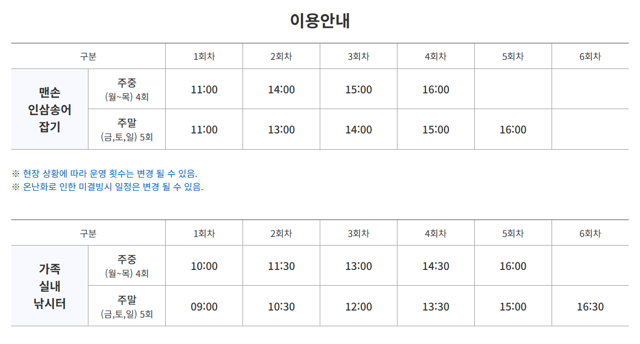 ✅ 예매방법: 예매는 텐트 낚시만 온라인 예매 가능하며, 나머지는 현장 발권만 가능합니다.