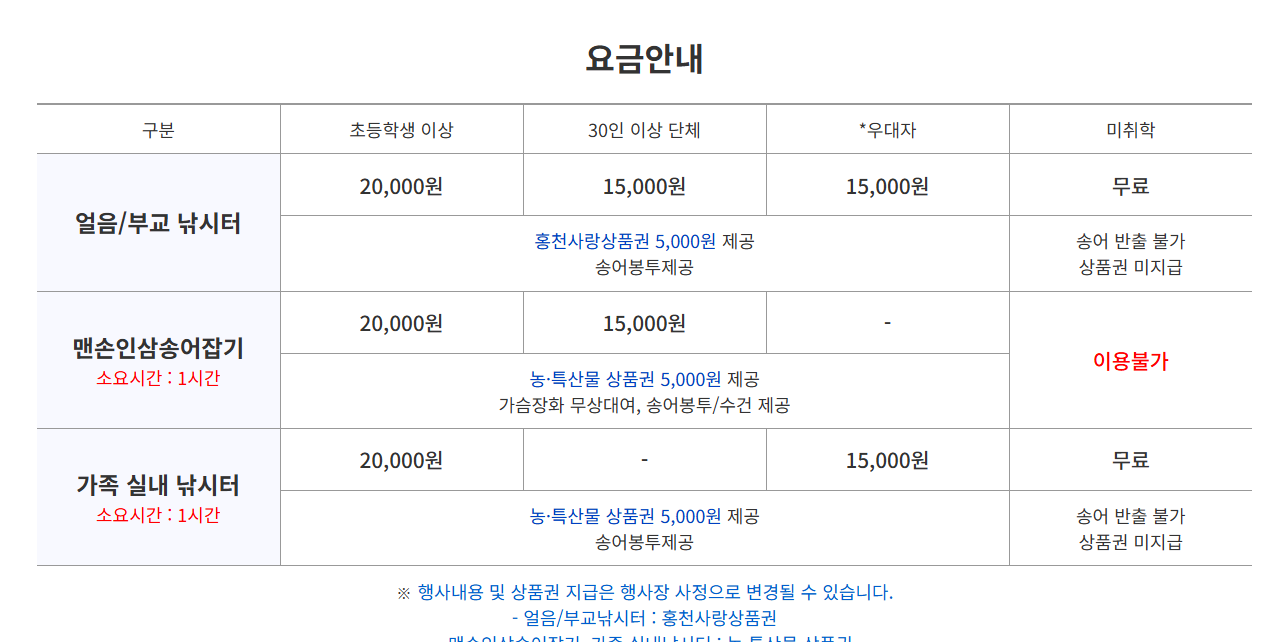 - 산천어 체험 예약방법: 현장예약과 온라인 예약이 있습니다. 편하시는 방법으로 예약하세요. 온라인예약은 아래의 글을 참고하세요!