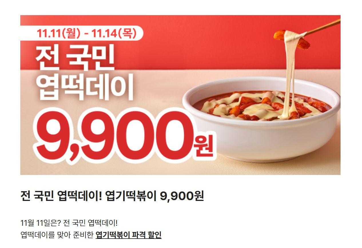2024년 엽떡데이는 11월 11일부터 11월 14일까지 진행됩니다. 이 기간 동안에는 특별히 정해진 가격인 9,900원에 엽기떡볶이를 즐길 수 있습니다.