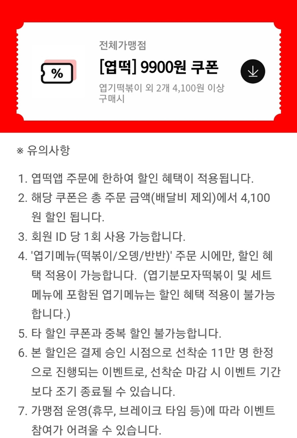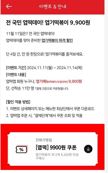 둘째, 쿠폰 사용은 엽기떡볶이 앱에서만 가능하므로, 다른 방법으로는 할인 혜택을 받을 수 없습니다.