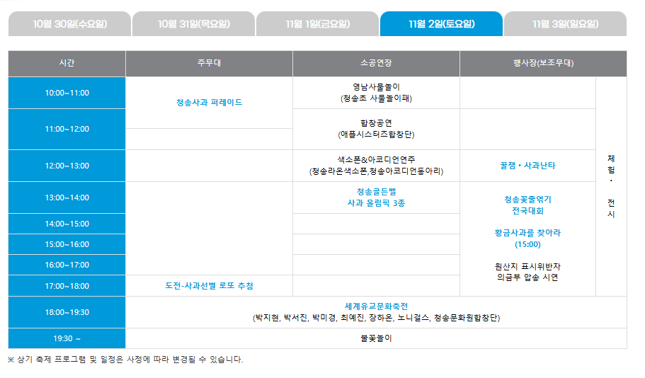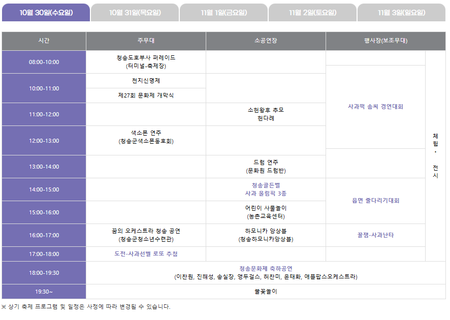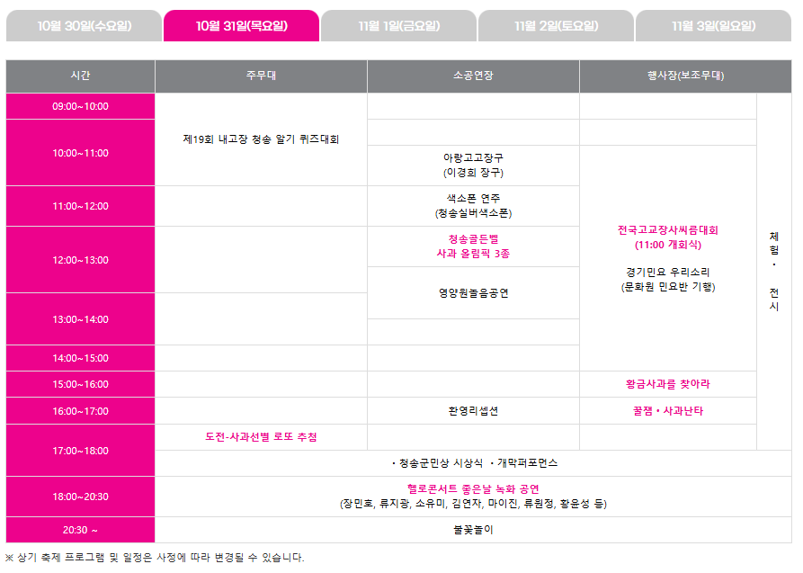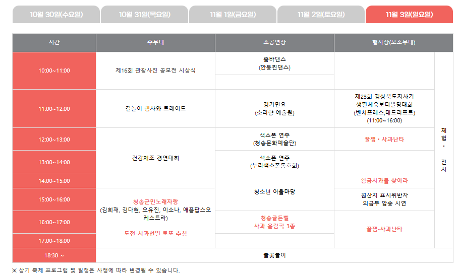 이번 청송사과축제에서는 다양한 인기 가수들이 축제 기간인 5일 동안 공연을 펼칠 예정입니다. 가수별 공연 일정은 아래를 참고하셔서 축제와 함께 멋진 무대를 즐겨보세요!