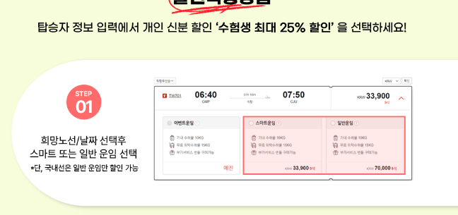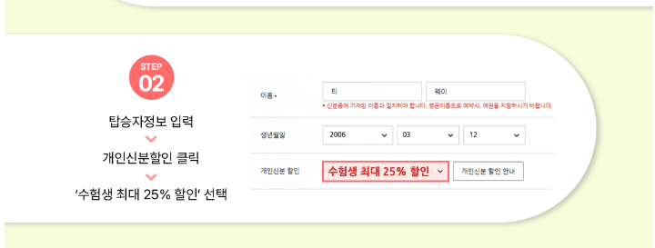 ② 탑승자 정보 입력 시 ‘수험생 최대 25% 할인’을 선택하세요.