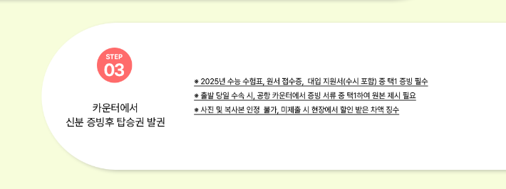 🔔 필수 서류(출발 당일 공항 카운터 제출): 2025년 수능 수험표, 대입 원서 접수증, 대입 지원서 (수시 포함) 중 한 가지 원본 ★ 주의: 사진이나 복사본은 인정되지 않습니다.